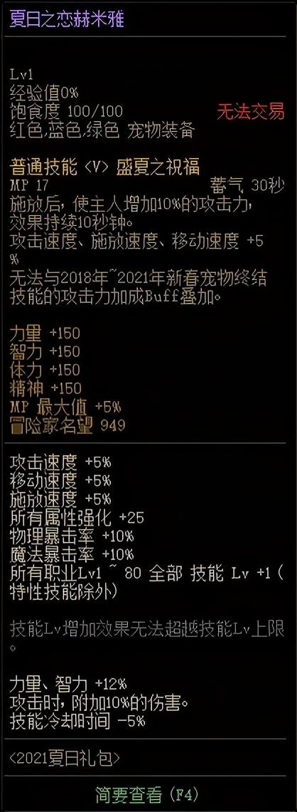 升级后的夏日宠物,属性持平今年的普通新春宠物,相比活动“大飞空时代”赠送的比拉谢尔号宠物,多了10四维、1属强、51~80技能+1与一个宠物技能(10%攻击力)。对没有新春宠物的小伙伴们提升较大,若有活动入场券则建议优先兑换宠物升阶。